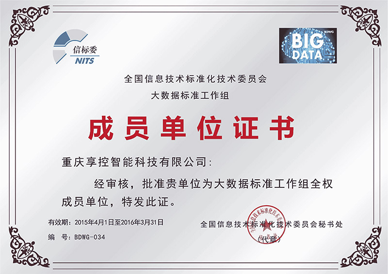 全國信標(biāo)委批準(zhǔn)重慶享控智能科技有限公司為“大數(shù)據(jù)標(biāo)準(zhǔn)工作組全權(quán)成員單位”